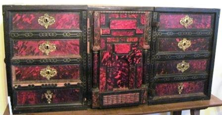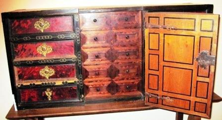 - Bargueño de influencia italiana en madeira policromada imitando un acabado en carei e bronce. Dividido en tres rúas: as laterais contan con catro caixóns cada un, coa súa correspondente pechadura e embelecedor, un palastro de latón; a central, organizado a modo de portada dístila que alberga un arco de medio punto coroado a base de placas voadas e recortadas, sobresae en planta cunha porta con dobre bisagra que dá acceso a cinco caixóns en marquetería. Decorado todo o frontal con fileteado metálico en latón embutido describindo círculos encadeados.