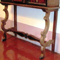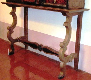 - Mesa tipo buffet en madeira de nogueira para bargueño, de catro patas, as anteriores rectas e as frontais de lira, unidas por cabia inferior floriforme policromada en negro nos plementos.