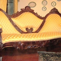 - Sofá tres prazas isabelino en madeira de caoba tallada con motivos vexetais, de palmeta acantiforme nos brazos e divisións en aspa avolutada dos asentos, coroados estes con copetes calados nos extremos e central avenerado; salienta o amplo faldón tallado con motivos fitomórficos e as patas, que son cabriolé, co recorrente ornamento en forma de palma de loureiro, reminiscente do estilo Imperio. A tapicería en cor amarelo (a orixinal era vermella).