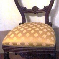 - Cadeira isabelina en madeira de caoba tallada con motivos vexetais, tapicería de cor amarelo, apoiada en catro patas cabriolé. Respaldo curvo.