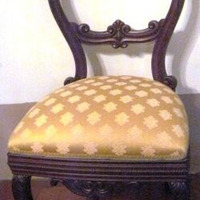 - Cadeira isabelina en madeira de caoba tallada con motivos vexetais, tapicería de cor amarelo, apoiada en catro patas cabriolé. Respaldo curvo.