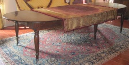 - Mesa comedor estensible en dúas fases, en madeira de caoba, de planta ovoidal, con lixeiro faldón na cintura e apoiada en seis patas abalaustradas, bulbosas no imóscapo e estranguladas cabo dos pés, que van sobre cadansúa roda.