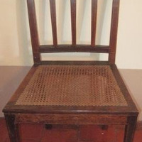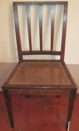 - Cadeira en madeira de caoba, coa pá dividida en tres montantes planos, de menor lonxitude que os laterais. O asento, trapezoidal, de reixiña. Presenta unha cintura lisa de decoración e catro patas afusadas. Deseño propio de mobiliario de oficina, non de ceador, propio dos anos 20-30, inspirado en modelos ingleses e americanos, producidos en serie, funcionais.
