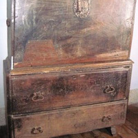 - Bargueño en madeira de castiñeiro. Composto de dous corpos: o inferior, un taquillón soporte do escritorio, é un caixón de taboleiros enteirizos ensamblado con cola de miñato con dous caixóns na cara frontal, grandes e con dúas asas de ferro recurvadas, en forma de C invertida; vai apoiado este corpo en dúas zapatas coa súa face tallada en estrías; o contador superior, ensamblado en cola de miñato reforzado con cantoneiras de ferro forxado e bisagras flordelisadas, organízase en once gabetas con tirador central circular en madeira tallada, flanqueado o tirador por placas resalteadas de perfil ovalado e resalte central, e orlado o perímetro cunha grilanda tallada policromada en vermello. Os caixóns arrodean unha lacena central con pechadura. Conta con tapa abatible mediante bisagras e perno de feche superior. A fechadura da tapa vai ornamentada cun palastro de ferro forxado con tracería calada. Nos costados, asas de ferro forxado, curvas e abalaustradas.