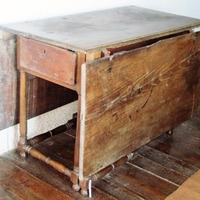 - Mesa estensible de dúas ás abisagradas, en madeira de castiñeiro; con seis patas lisas con chambrana torneada, dúas delas abatibles. O corpo conta con dous caixóns laterais.