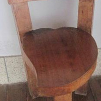 - Cadeira feita en madeira de castiñeiro con asento en forma de corazón e apoiada en tres pés.
