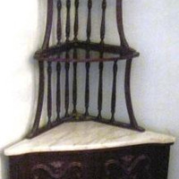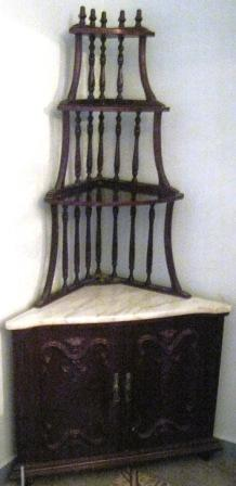 - Moble esquineiro; a parte inferior cunha lacena con dúas portas e aplicacións en madeira tallada, repisa en mármol e parte superior tres estantes con barrotes.