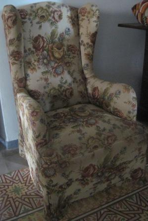 - Butacón con orelleiras con dous brazos, tapizado en tea con estampados florales en tons roxos e ocres.