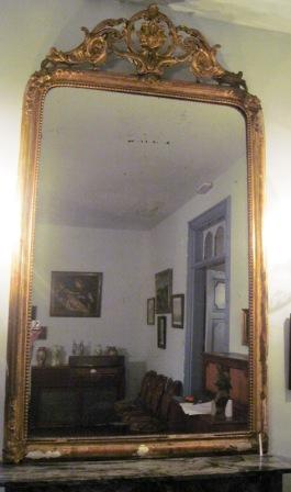 - Espello tremó con marco en madeira e estuco, de perfil curvo e sobredourado. Rematado na parte superior cunha tarxa vexetal a modo de copete flanqueada por motivos acantiformes. Daquel momento isabelino no que se recuperaron motivos decorativos do rococó cortesán.