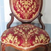 - Butaca Isabelina de mediados do XIX en madeira de caoba con tapizado en tea de veludo en tons granates e ocres con motivos vexetais, respaldo ovalado e patas cabriolé.