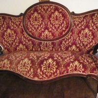- Canapé isabelino de mediados do XIX en madeira de caoba, tapizado en tea de veludo en granate e tons ocres. Patas cabriolé.