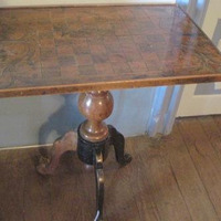 - Mesa de xogos co taboleiro do xadrez debuxado e nos extremos motivos vexetais de roleos, que se sostén nun soporte central rematado en tres pequenas patas avolutadas.