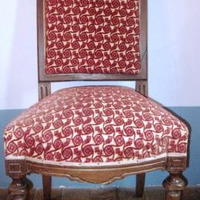 - Cadeira de catro patas torneadas en aneis, ao estilo Rexencia inglés, e tapizada en tons granates e amarelo.