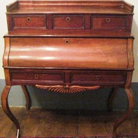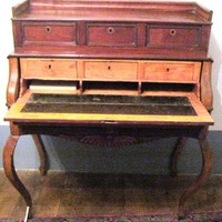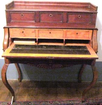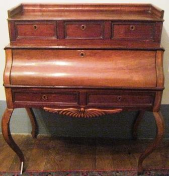 - Moble buró, sorte de bonheur de jour feminino, dese estilo Luis XV depauperado do XIX, lixeiramente panzudo, con dous caixóns na parte inferior, tres na superior e tapa abatible, apoiado en catro patas cabriolé e con motivo decorativo de palmeta no centro da cintura.