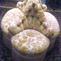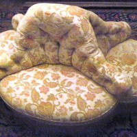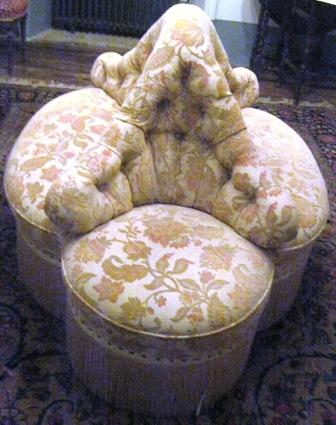 - Confidente de catro corpos. Parte central con capitoné. Tapizado en tons ocres con motivos florais tipo Paisley e rematado en flocadura perimetral no faldón con pasamanerías de cordón. Apoiado en dez patas con rodas.