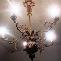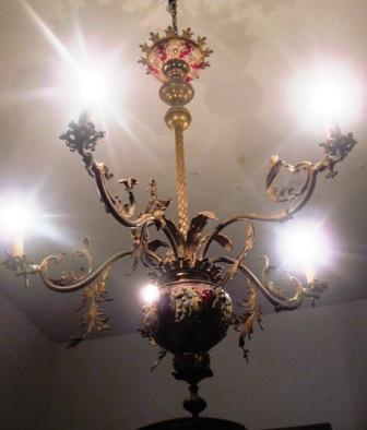 - Araña de cinco brazos de latón decorados con roleos vexetais, vástago torneado e macolla de maiólica granate e beixe, de posíbel orixe italiana.