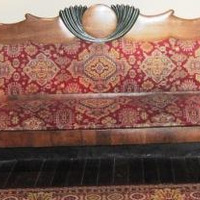- Sofá de tres prazas tipo Biedermeier, con respaldo e apoiabrazos en forma de palmeta e copete vexetal, laterais e asento acolchado tapizado á otomá en tea de veludo en tons amarelos, roxos e ocres. Apoiado en catro patas en madeira torneada en cor negro.