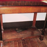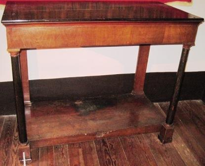 - Mesa de nogueira e cerdeira, apoiada en catro patas, as frontais de orde columnario toscano sobre pedestais cadrangulares, e as traseiras, piastras lisas de igual orde e baseamento.