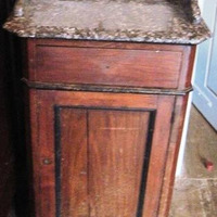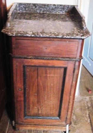 - Mesa de noite en madeira de castiñeiro, coas súas esquinas cortadas en chafrán. Porta no frontal resalteada cun cadrón: dá paso á lacena interior, que conta cun estante e caixón. Repisa en mármore gris veteado con antepeito no fondo.