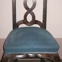 - Cadeira de castiñeiro, estilo Raíña Ana, co respaldo en forma de oitos entrelazados e asento tapizado en veludo azul. Patas cabriolé con chambrana.