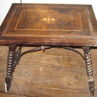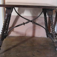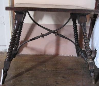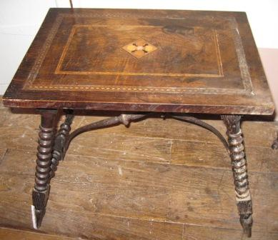- Mesa de noite con taboleiro en madeira de marquetería, cunha flor tetrapétala enmarcada por un losange. A corola, en nácara. O cerco da mesa decórase con marquetería perimetral de motivos xeométricos. Apoiada en catro patas en madeira torneada, lenticulares, en madeira de cerdeira, con chambrana e fiadores de ferro forxado. Probabelmente fora o soporte dun contador ou bargueño.