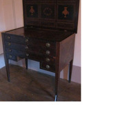 - Toucador estilo Carlos IV con embutidos en marquetería de madeiras nobres con dous caixóns pequenos, outros dous máis grandes e, na parte superior, tres apartamentos para gardar obxectos; na central, un marco para un espello móbil, a modo de psiqué. Tiradores en bronce e tapadeira abatible. Patas afusadas e motivos ornamentais estilo Imperio (xarróns e grilanda floral central)
