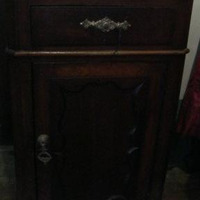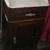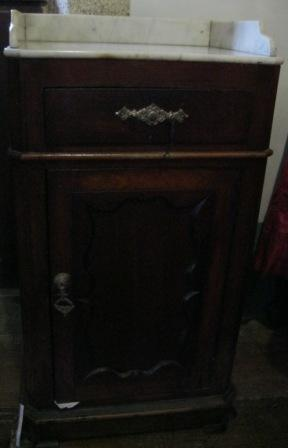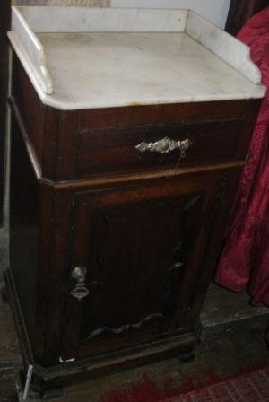 - Mesa de noite en madeira de castiñeiro. Na parte inferior lacena cunha balda, na superior un caixón e tiradores en metal branco. Parte de arriba en mármore branco.