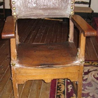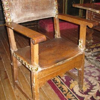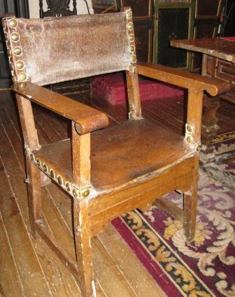 - Butaca fradeira en madeira, asento e respaldo en coiro rematado en cravos de cabeza circular en bronce. Apoiado en catro patas unidas en chambrana. Conta con dous apoiabrazos.