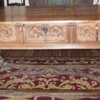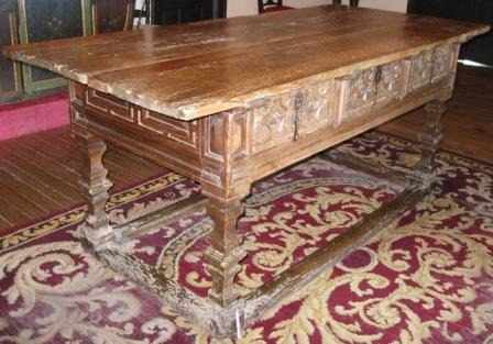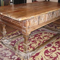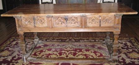 - Mesa comedor en madeira de castiñeiro tallada, con triple caixoneira e tiradores en ferro. Falda da mesa con decoración xeométrica. Vai apoiada en catro patas molduradas a modo de balaústres e unidas en chambrana.