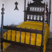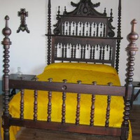 - Cama portuguesa en madeira de castiñeiro torneada con decoración emblemática no cabeceiro. Orgaínzase por medio de catro grandes mastros torneados, máis altos os correspondentes ao cabeceiro, coroados por un pináculo de base bulbosa. O cabeceiro está resolto a modo de peita distribuída en dous pisos organizados en arquerías que alternan balaústres torneados e pinxantes que caen do centro de cada arco; flanquean o edículo dúas volutas acantiformes e eseadas. Resérvase o centro do tímpano resultante para acoller a talla dun froito, quizais un marmelo. Do edículo parten dúas láureas voantes, motivos que axudan a precisar a cronoloxía do moble.