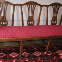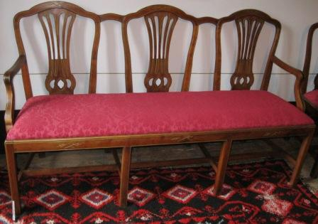 - Sofá canapé de tres prazas en madeira de caoba, con apoiabrazos. Apoiado en 8 patas afusadas unidas por travesaños. Asento acolchado en tea adamascada de cor granate. Decoración de rameados sobredourados nos frontais e unha sorte de lira no respaldo (en realidade tipo shieldback), ao estilo Imperio ou Country Chippendale interpretado por Dunchan Phyfe. Da casa Cabezas, en Chantada, réplica do mesmo canapé do cuarto do Bispo. Froito dun encargo de José Taboada Zúñiga.