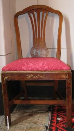 - Cadeira en madeira de caoba. Asento acolchado en tea adamascada en cor granate. Catro patas afusadas unidas por travesaños. Respaldo cunha sorte de lira (en realidade tipo shieldback)ao estilo Imperio ou Country Chippendale interpretado por Dunchan Phyfe. Da casa Cabezas, en Chantada, copia das cadeiras do XIX da Sala de Armas, froito dun encargo de don José Taboada Zúñiga.