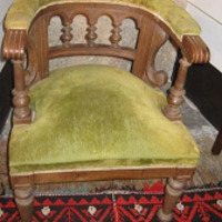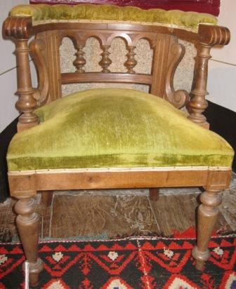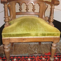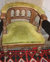 - Butaca en madeira con respaldo semicircular en madeira torneada con catro arquiños. Asento e parte superior do respaldo acolchado e tapizado con veludo verde musgo. Apoiada en catro patas, as dianteiras tamén torneadas e as traseiras lisas.