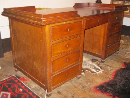 - Mesa de despacho en madeira de caoba, coa parte central oca e catro caixóns a cada lateral e unha parte central. Por outro lado, unha lacena en cada lateral cun caixón na parte superior e na central tamén oco cun caixón na parte superior.
