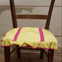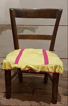 - Cadeira en madeira, asento en palla, con catro pés unidos en chambrana.