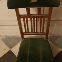 - Reclinatorio apoiado en catro pés. Asento e apoiabrazos tapizado en tea de veludo verde, coas iniciais P. C. (Pura Cuenca). Frente con sete barrotiños.