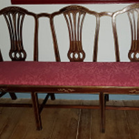 - Sofá tres prazas en madeira de caoba, con apoiabrazos. Apoiado en 8 patas unidas por travesaños. Asento acolchado en tea adamascada de cor granate. Decoración de rameados sobredourados nos frontais e unha sorte de lira no respaldo, ao estilo Imperio ou Country Chippendale.