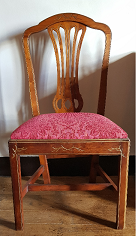 - Cadeira en madeira de caoba. Asento acolchado en tea adamascada con granate. Catro patas afusadas unidas por travesaños. Respaldo cunha sorte de lira ao estilo Imperio ou Country Chippendale de acordo coa interpretación feita por Duncan Phyfe. Da casa Cabezas, en Chantada, copia das cadeiras do XIX da Sala de Armas, froito dun encargo de don José Taboada Zúñiga.