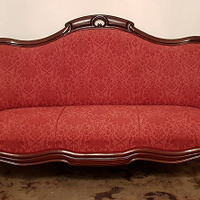 - Sofá tres prazas en madeira de caoba, con asento e respaldo ondulado con tímido copete ornamental calado en forma ovoide, e dous apoiabrazos tapizados en tea adamascada de cor granate. Apoiado en catro patas cabriolé, as dúas de adiante rematadas con rodas. A cintura, mixtilínea.