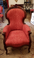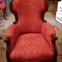 - Butaca en madeira de caoba con asento, respaldo e dous apoiabrazos acolchados e tapizados en tea adamascada de cor granate. Apoiado en catro patas cabriolé, as dúas dianteiras con rodas.