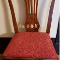 - Cadeira en madeira de caoba con respaldo e asento acolchado tapizado en tea adamascada cor granate. O respaldo vai decorado cunha sorte de lira ao estilo Imperio. Decoracións de rameados nos frontais. Patas afusadas unidas en chambrana. Tipo das que facía Duncan Phyfe.