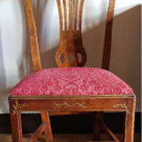 - Cadeira en madeira de caoba con respaldo e asento acolchado tapizado en tea adamascada cor granate. O respaldo vai decorado cunha sorte de lira ao estilo Imperio. Decoracións de rameados nos frontais. Patas afusadas unidas en chambrana. Tipo das que facía Duncan Phyfe.