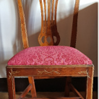 - Cadeira en madeira de caoba con respaldo e asento acolchado tapizado en tea adamascada cor granate. O respaldo vai decorado cunha sorte de lira ao estilo Imperio. Decoracións de rameados nos frontais. Patas afusadas unidas en chambrana. Tipo das que facía Duncan Phyfe.