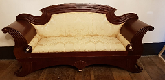 - Sofá de tres prazas tipo fernandino anovado baixo a estética Art Dèco, visíbel na palmeta do faldón, en madeira de caoba tallada, tres apliques de pasta branca imitación do marfil, no asento e respaldo, este de perfil mixtilíneo acolchoado en tea adamascada en cor crudo. O asento é rectangular con dúas almofadas cilíndricas e os brazos, curvos cara os lados.