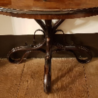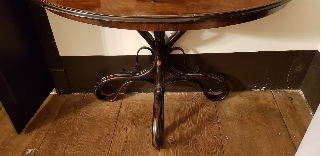 - Mesa velador en madeira de caoba con forma de media lúa, réplica do modelo Thonet nº 43. Pé derivado en tres pés formando volutas e pináculo central no vástago de unión.