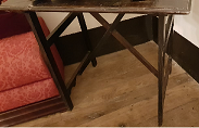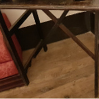 - Mesa en madeira de castiñeiro con catro patas unidas por chambrana e fiadores na mesma madeira.
