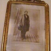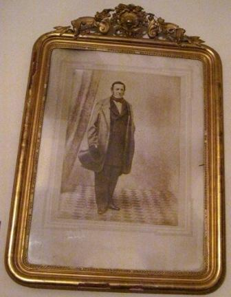 Retrato en fotografía en branco e negro, posíbel ampliación dunha carte de visite, de don Ramón Bermúdez de Castro y Rascón (falecido en 1910), vizconde de Revilla de Barajas. Sostendo o sombreiro de copa nunha man, con amplo abrigo, e traxe cruzado de tres pezas. Con marco en madeira, rectangular de ángulos recurvados, sobredourado e con adornos florais en estuco na parte superior flanqueando un copete con xarrón de flores, no mesmo material.
