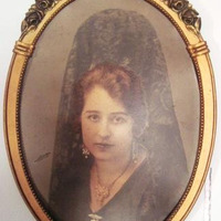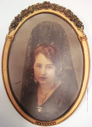 - Fotografía coloreada de Mª Paz Taboada, toucada con mantilla, con sapo e pendentes dourados, asinada por Ksado. Marco ovalado en madeira sobredourada con orla superior de grilanda de rosas.