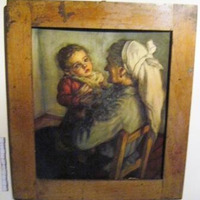 - Lámina a cor que representa a unha anciá co seu neto. Marco en madeira