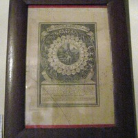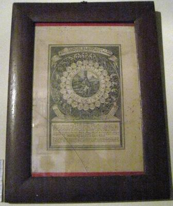 - Gravado que representa un reloxo cristián, devocionario da Paixón, ou Horario da Paixón, litografía do XIX presente nos devocionarios daquela época: entre a noite e o día ten repartida a Paixón de Noso Señor Xesucristo e as dores da Virxe. Marco en madeira.